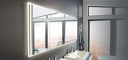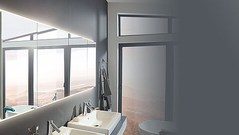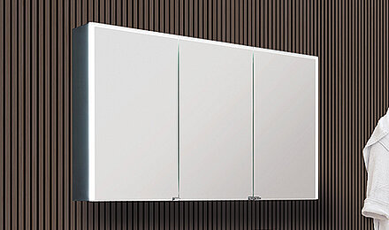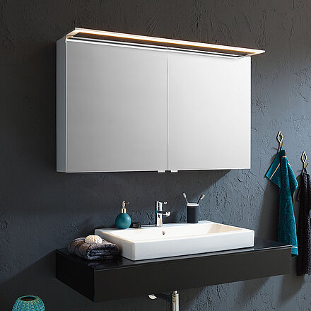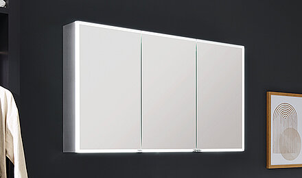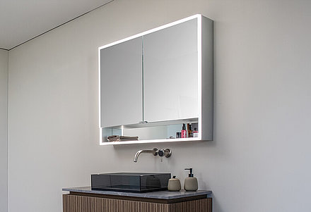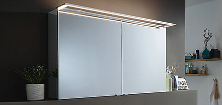 Sie können zwischen diversen Lichtvariationen wählen: ob beleuchtete Rückwände, Aufsatz- und Pendelleuchten oder Innenraum- und Waschtischbeleuchtung. Ein Doppelwippschalter und zwei Steckdosen hinter der rechten Außentür komplettieren Ihren Spiegelschrank.