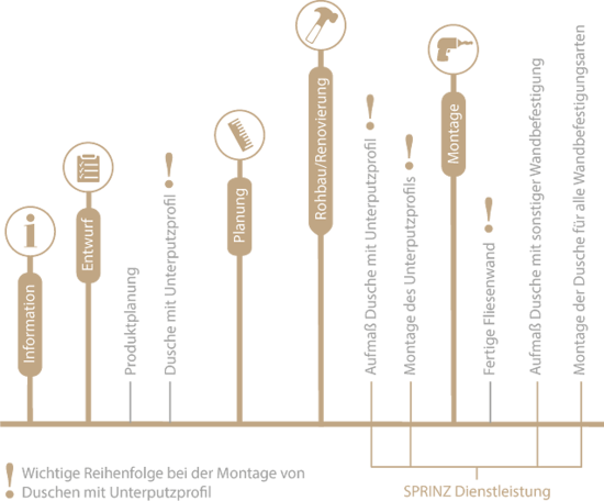 Zwischen Entwurf und Montage liegen einige Arbeitsschritte, die gut geplant sein wollen. Damit beispielsweise Unterputzlösungen in Neubau oder bei einer Modernisierung realisiert werden können, muss der Untergrund rechtzeitig vorbereitet werden. Das SPRINZ-Team steht Ihrem Fachplaner und Handwerker gerne bei Rat und Tat zur Seite. Wir senden einen Aufmaß-Service, der alle Daten für Seitenwände, Türen, Rückwand-Verglasung und Duschboden erfasst. Anschließend werden die Anforderungen im SPRINZ-Werk geprüft und umgesetzt.