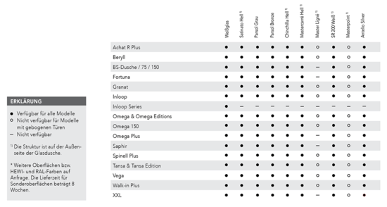 Sie wollen Ihre Dusche mit einer besonderen Oberfläche? Dann sehen Sie in der folgenden Tabelle, welches Modell mit welcher Glasart kombinierbar ist.