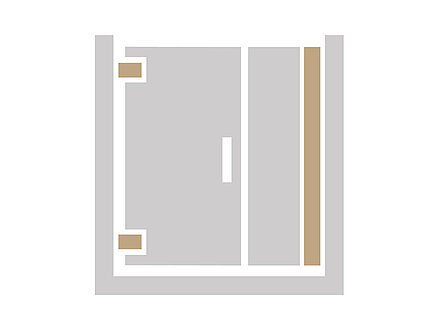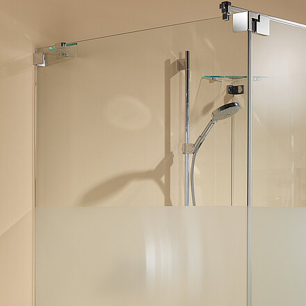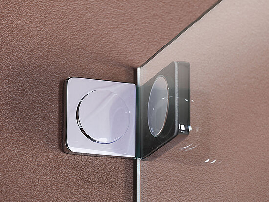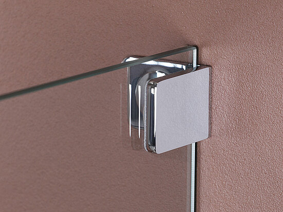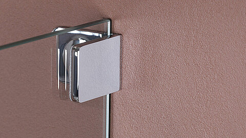 Rahmenlose Glaselemente von Duschen können elegant und stabil mit einem Wandwinkel befestigt werden. Für makelloses Design sind die Wandwinkel reduziert gestaltet und oberflächenbündig in das Einscheiben-Sicherheitsglas eingelassen. Sie können die Wandwinkel auf Türgriffe der Dusche und Armaturen im Bad abstimmen. SPRINZ bietet dafür verschiedene Oberflächen wie in Silber matt, Chrom oder Sonderoberflächen.