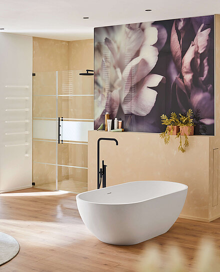 Wer lieber auf Farbe setzt, gestaltet die Glaselemente in einem stimmigen Farbkonzept. Beispielsweise hebt eine farbige Duschrückwand den Duschbereich optisch hervor und verleiht dem Badkonzept eine besondere Note.