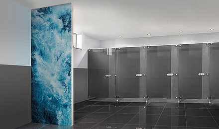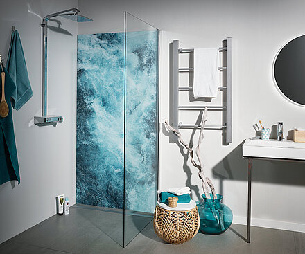 Tatsächlich eignet sich Glas sehr gut für die Verwendung im Nassbereich. Das Material ist robust, pflegeleicht und edel. Wandpaneele aus Glas sind auch praktischer als Fliesen: Durch die großflächigen Maße können diese nahezu fugenlos auf die Wand aufgebracht werden. Dadurch entstehen großflächige Wandbilder ohne Unterbrechung, die dank ihrer glatten Oberfläche auch noch leicht zu reinigen sind.