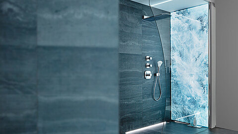 Den letzten Schliff verleihen Sie Ihrer Glaswand mit Beleuchtung: Das System Premium LED ermöglicht beispielsweise beleuchtete Duschrückwände mit einzelnen Lichtfarben wie rot, grün, blau. Eine Kombination von Weißlicht mit einem Bildmotiv rückt Ihr Glas mit Motiv in den Vordergrund.