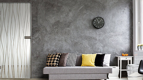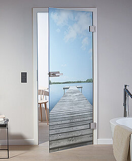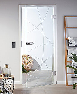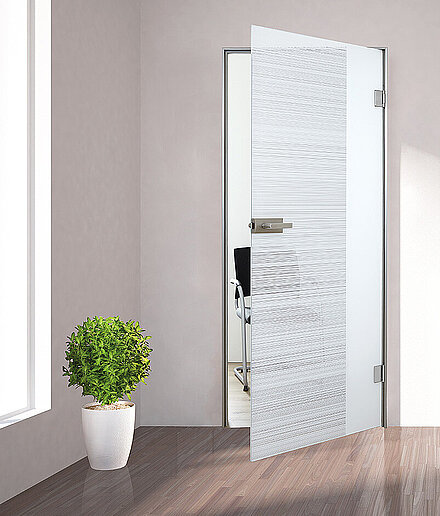 Eine Innentür aus Glas kann mit verschiedenen Motiven mit Keramikdruck gestaltet werden. Sie sind lichtecht, lösungsmittel- und DIN abriebbeständig.