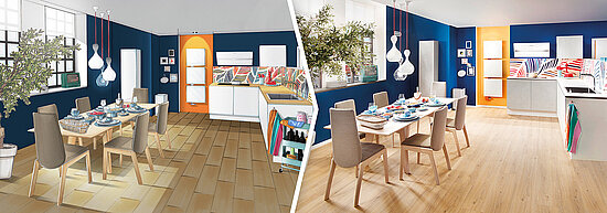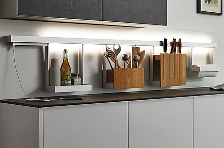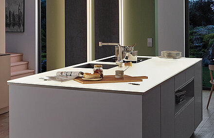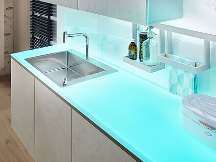 Küchenfronten und Arbeitsplatten können durch energieeffiziente LED-Beleuchtung und Farbauswahl an Ihre Wünsche angepasst werden. Zusätzlich zu Glas fertigt SPRINZ Oberflächen auch aus langlebiger Porzellankeramik. Sie haben bauliche Besonderheiten in Ihrer Küche? Auf Wunsch werden Schrägschnitte, Rand- und Eckausschnitte gesetzt, um die Küchenmöbel perfekt an Ihren Raum anzupassen. Informieren Sie sich gerne über die Möglichkeiten zur Küchengestaltung.