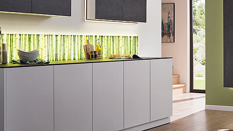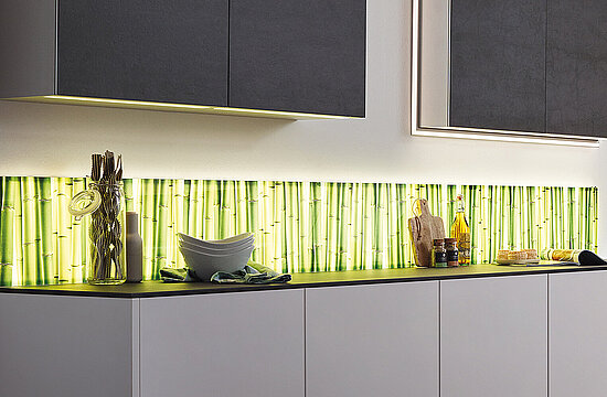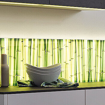 Wenn Sie spezielle Wünsche bei der Farbgestaltung einer Arbeitsplatte haben oder Ideen für die Küchenrückwand suchen, sind Sie hier richtig. Wählen Sie eine bedruckte Glasplatte, edle Porzellankeramik oder stylishes LED-Licht. Die Küchenrückwand gestalten Sie optional einfarbig oder mit Motiv, mit stimmungsvoller LED-Beleuchtung oder auch mit Porzellankeramik. Brillante Bilder finden Sie dazu in der SPRINZ-Motivwelt. Auf Wunsch drucken wir Ihr liebstes Bild individuell nur für Sie.