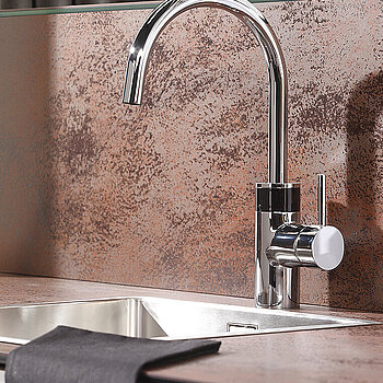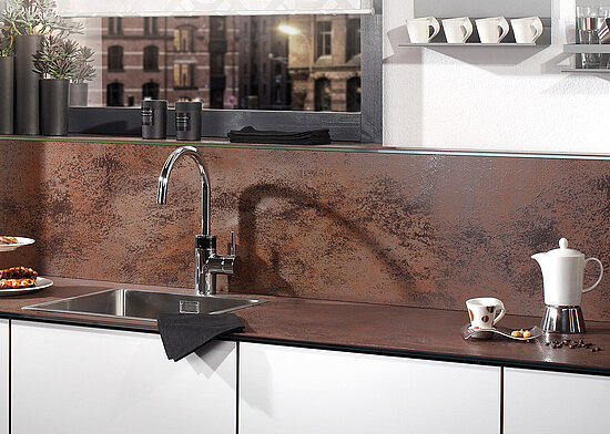Mit den sechs zur Auswahl stehenden exklusiven Oberflächen von SPRINZ entstehen ganz besondere Küchen. Die Porzellankeramik im Verbund mit Glas ist härter als Granit, so leicht wie Aluminium und individuell bearbeitbar. Rückwände werden in besonders großer Länge an einem Stück gefertigt. Ausschnitte für Schalter, Steckdosen etc. werden im Werk exklusiv auf Maß angepasst.