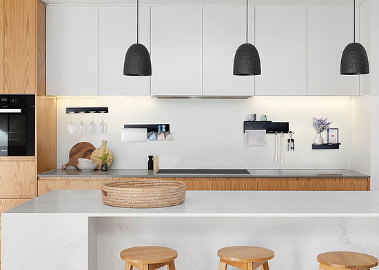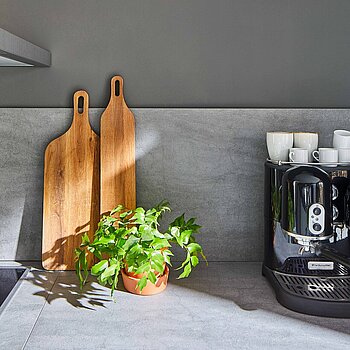 Die Nischenrückwand wird mit einer Länge bis zu 4.000 mm an einem Stück ohne Stoßfuge montiert. Alle Ausschnitte, individuelle Eck- und Flächenausschnitte werden nach Maß integriert. Auf Wunsch lässt sich die Glasrückwand mit Magnethalterung wieder abnehmen. Eine Silikonversiegelung ist in diesem Fall überflüssig.