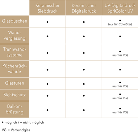 Der Digitaldrucker überträgt das Druckbild direkt vom Computer auf die Glasoberfläche. Im Gegensatz zum keramischen Siebdruckverfahren wird kein Sieb benötigt. Für brillante Farben sorgt die leicht satinierte Anmutung der getrockneten Tinte. Die UV-Aushärtung nach dem Print steigert die Festigkeit des Drucks. Die maximale Glasgröße für den SpriColor UV-Digitaldruck beträgt 3.200 x 1.600 mm. Größere Formate auf Anfrage, Glasgewicht max. 80 kg.