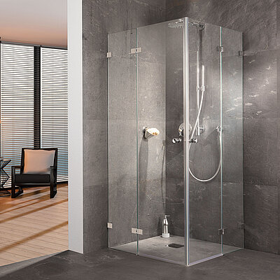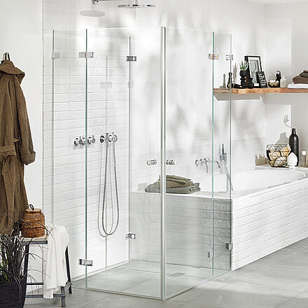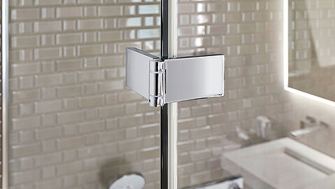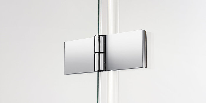 Filigrane, hochwertige Beschläge verbinden bei der rahmenlose Dusche die Glaselemente der Wand oder Tür miteinander. Dabei sind diese oberflächenbündig in das Sicherheitsglas (ESG) eingelassen. Dies erleichtert Reinigung und Pflege.