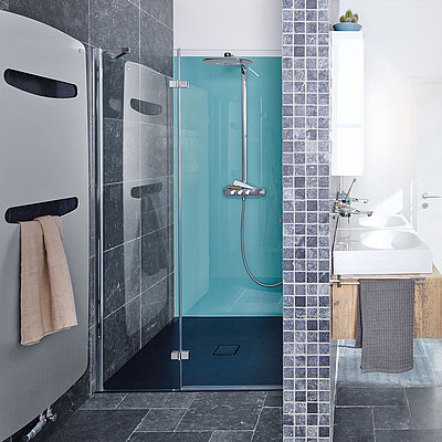 - Durchgehende, vertikale Dichtung im Scharnierbereich (Glas/Wand) sorgt für optimalen Spritzschutz
