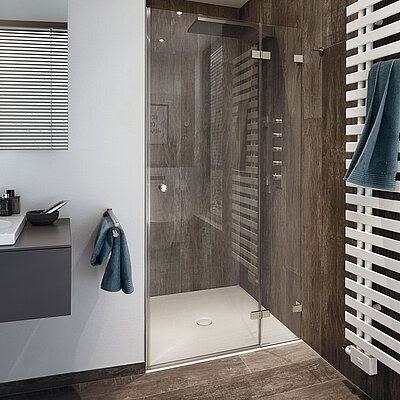 Mit einem oder zwei Flügeln gewähren Schwingtüren einen komfortablen und sicheren Einstieg. Die Duschtür kann mit diesem Mechanismus nach außen geöffnet werden. Beachten Sie, dass zum Öffnen ein ausreichend großer Bereich vor der Dusche vorhanden sein muss.