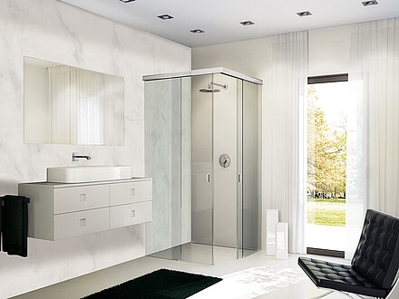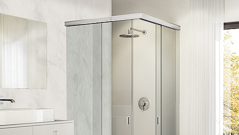 Profilduschen mit Schiebetüren sind stabil und perfekt für Bäder mit kleinem Grundriss. Sie bieten auch bei engen Platzverhältnissen großzügige Einstiegsbreiten. Clevere, aufklappbare Profile und Führungselemente sorgen für eine einfache Reinigung.