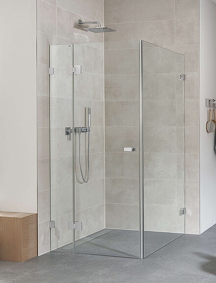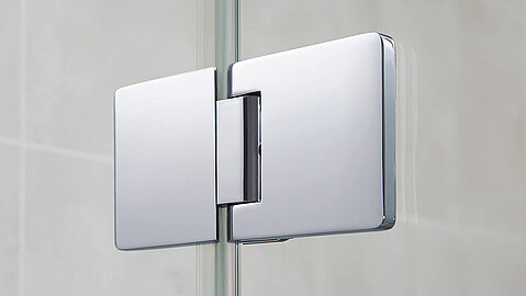 Filigrane, hochwertige Beschläge verbinden bei der rahmenlose Dusche die Glaselemente der Wand oder Tür miteinander. Dabei sind diese oberflächenbündig in das Sicherheitsglas (ESG) eingelassen. Dies erleichtert Reinigung und Pflege.