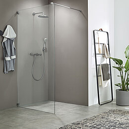 Bei einer teilgerahmten Dusche wird die Glasfläche mit einem Profil an der Zimmerwand angebracht. Damit können auch Unebenheiten oder leichte Schrägen ausgeglichen werden. So gleicht das Profil der teilgerahmten Dusche z.B. im Altbau vieles aus, wodurch der passgenaue Sitz von bodenebenen Duschen sicher und zuverlässig gewährleistet wird. Die Profile bieten z.B. größere Stabilität und Spritzwasserschutz und können mit flächenbündigen Beschlägen kombiniert werden.