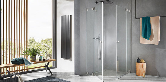 Filigrane, hochwertige Beschläge verbinden bei der rahmenlose Dusche die Glaselemente der Wand oder Tür miteinander. Dabei sind diese oberflächenbündig in das Sicherheitsglas (ESG) eingelassen. Dies erleichtert Reinigung und Pflege.