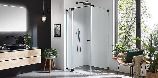 - Durchgehende, vertikale Dichtung im Scharnierbereich (Glas/Wand) sorgt für optimalen Spritzschutz