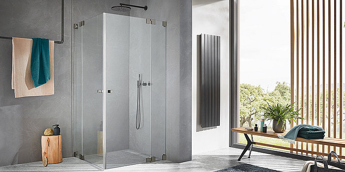 Filigrane, hochwertige Beschläge verbinden bei der rahmenlose Dusche die Glaselemente der Wand oder Tür miteinander. Dabei sind diese oberflächenbündig in das Sicherheitsglas (ESG) eingelassen. Dies erleichtert Reinigung und Pflege.
