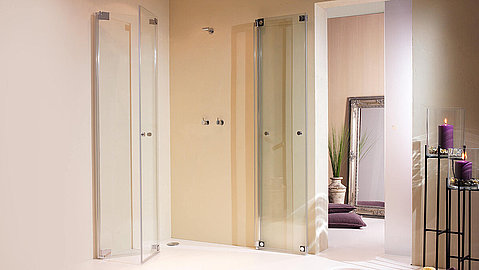 Die wegfaltbaren Duschwände sind für jeden Grundriss und jede Einbausituation geeignet. Die beweglichen Gläser können bei einer Pendelfalttür in beide Richtungen geklappt werden.