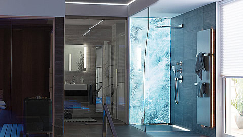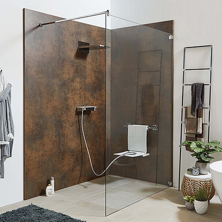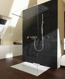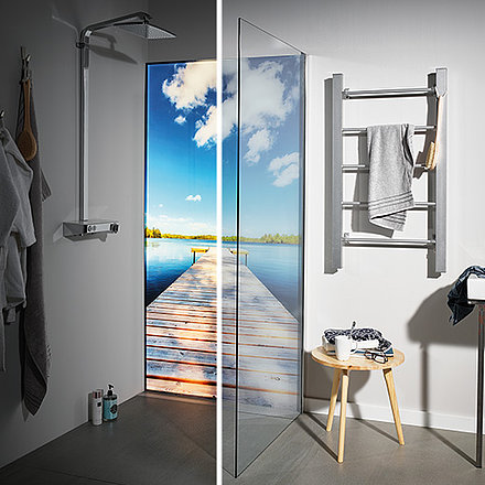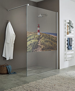 Erweitert um ein Rückwandmotiv oder einen Siebdruck direkt auf der Glaswand (auch in bunt) wird Ihre Dusche zum Designobjekt und Mittelpunkt im Bad.