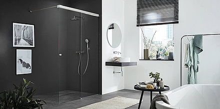 Durch die flächenbündigen Beschläge der Glaswand ist die Scheibe ohne Unterbrechung abziehbar. Bereits direkt nach der Dusche ziehen Sie das Glas bequem mit einem Wischer ab, um Rückstände zu vermeiden. Die Glasfläche bietet weniger Angriffsfläche für Schmutz und Kalk – mit unserer SpriClean® Glasveredelung verringert sich der Pflegeaufwand noch weiter.