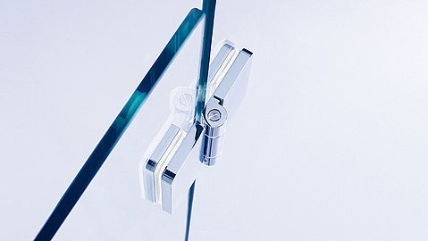 Delicate, high-quality fittings connect the glass elements of the wall or door in the frameless shower. These are embedded flush with the surface of the safety glass (ESG). This makes cleaning and maintenance easier.