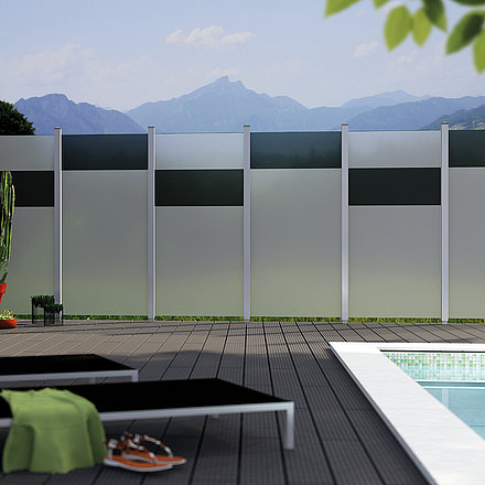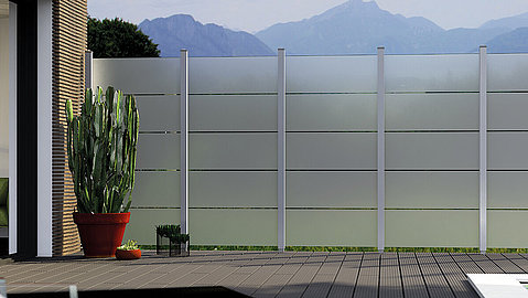 Die elegante, unsichtbare Glasklemmung hält dauerhaft, der Pfosten in Aluminium EV1 oder ähnlich Edelpatina und die Abschlusskappe aus Edelstahl setzen feine Akzente. Erhältlich ist das System in den Standardlängen 1.880 mm und 1.360 mm.